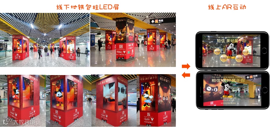 利用3D视错觉技术,让米奇和米妮IP形象“现身“地铁包柱玩起了捉迷藏游戏。当手机透过AR连动现场包柱后,你就可以召唤米奇IP形象到手机里,许下愿望,推送的商品会联动呈现于包柱内,手机端同步引导至线上会场,让整个线下线上的链路完全打通。