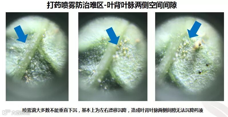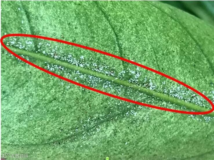 叶背处,叶脉两侧为叶螨产卵及活动的主要区域,白色为叶螨发育蜕皮,在防治过程中,叶背能否打到,叶脉间隙能不能铺展药液对药剂药效的发挥至关重要