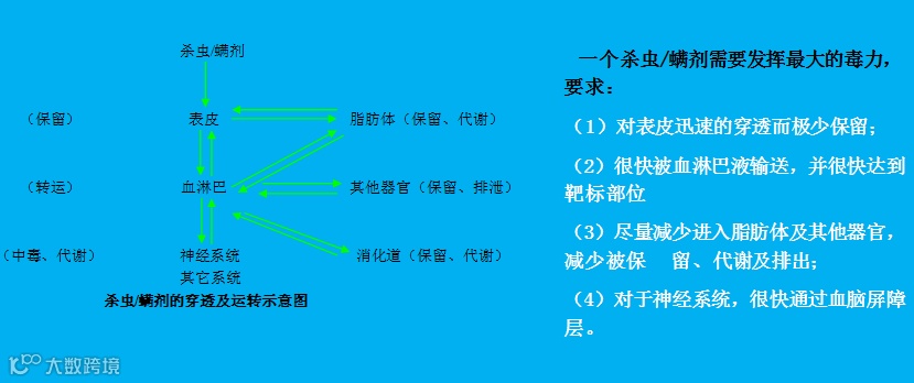 了解了杀虫杀螨剂在叶螨体内转运的方式后,什么是影响转运过程中药效发挥最大的因素呢?经过昆虫毒理学研究,我们发现药剂的油水分配比例决定了一个杀螨剂到达其作用靶标速度,一个杀螨剂穿透背毛、表皮、真皮、肠道、神经膜等的能力强弱决定性因素是该药剂的油水分配比例是否是最佳的。(ps:神经膜的穿透还与药剂电离常数、PH等因素有关)