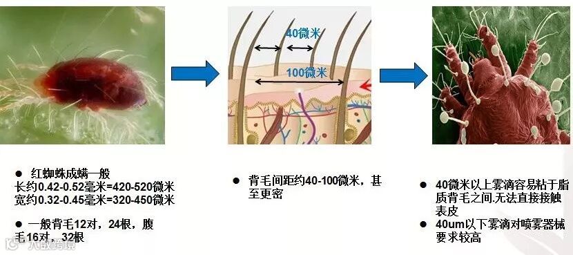 从上面分析我们可以看到一般的喷雾器械很难做到小于40um的喷雾直径,所以实际使用过程中喷雾雾化药液基本上都会被叶螨抵触于背毛之上或者腹毛之下,所以杀螨剂能否穿透背毛到达表皮成为决定杀螨剂效果的第一个因素。