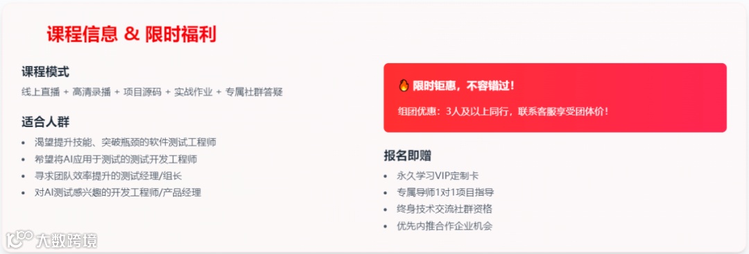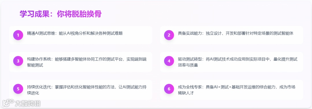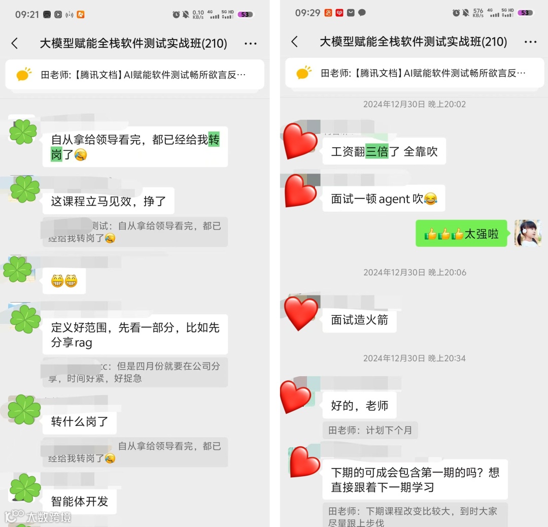 这些年,我们没搞过虚头巴脑的营销,不是扎在企业一线做 AI 测试定制开发部署,就是在关起门来打磨课程。从第 1 期到第 3 期,看着学员从 “只会功能测试” 到能独立开发智能体,从薪资翻倍到岗位升级,我们更确定:做实战课,就得让大家学完能落地、落地能提效。