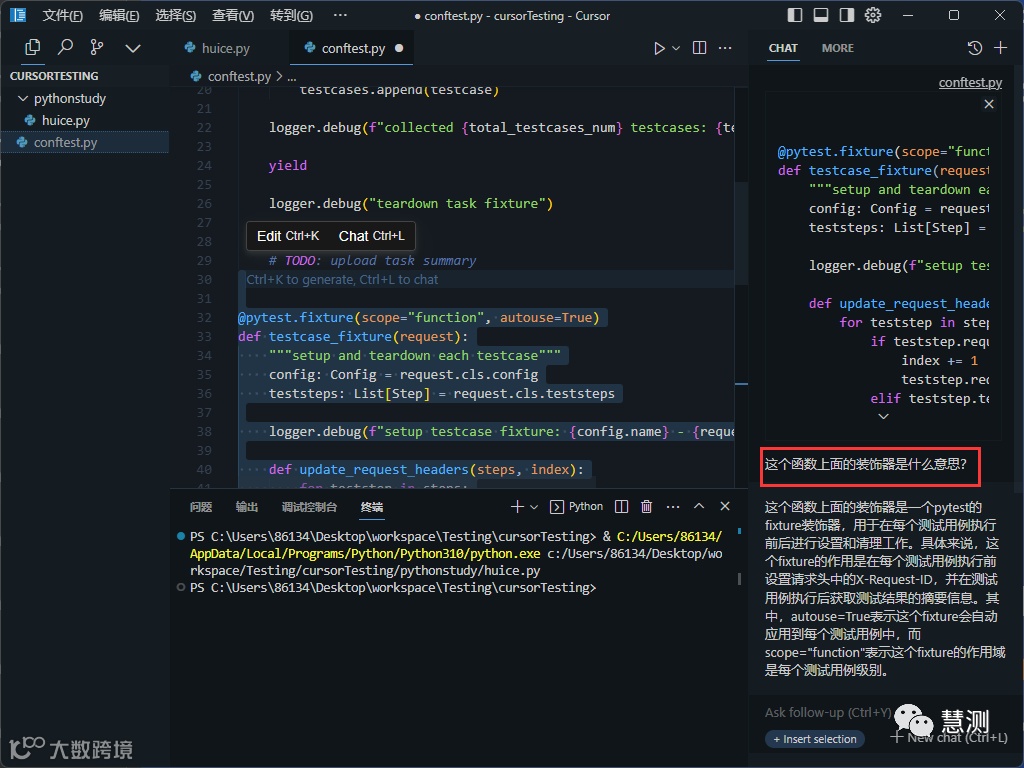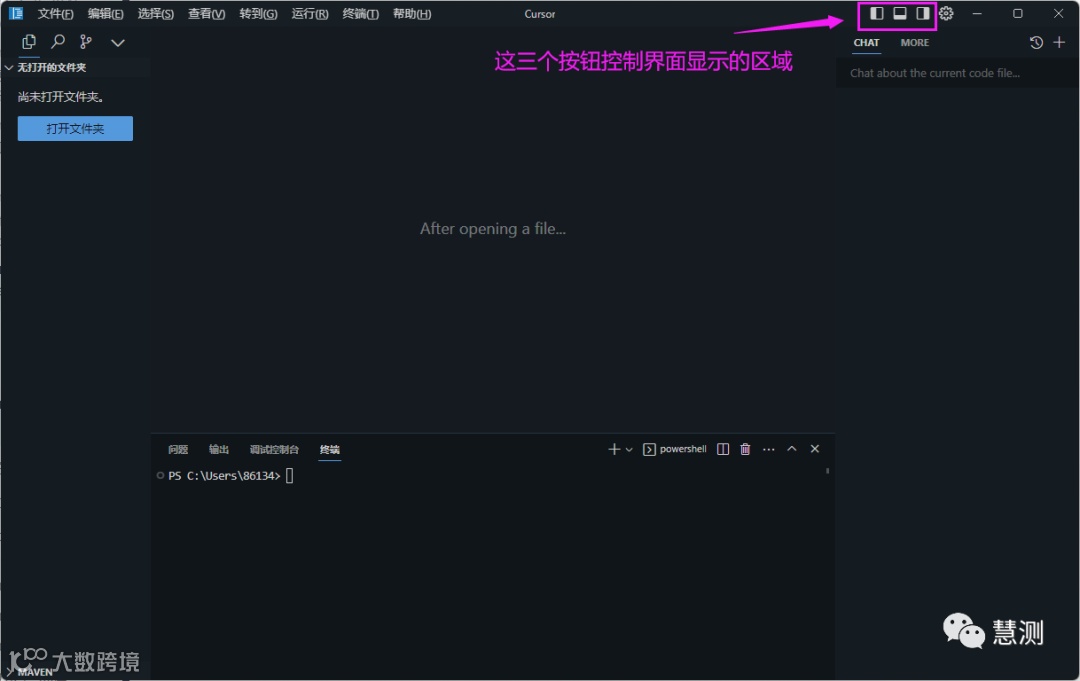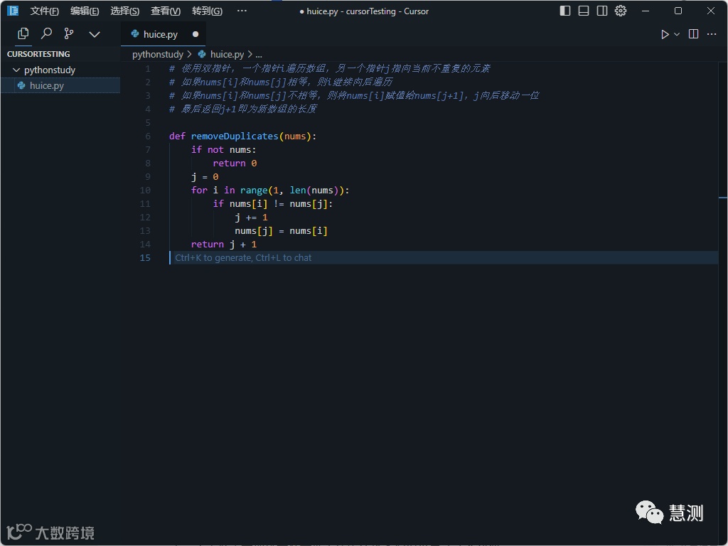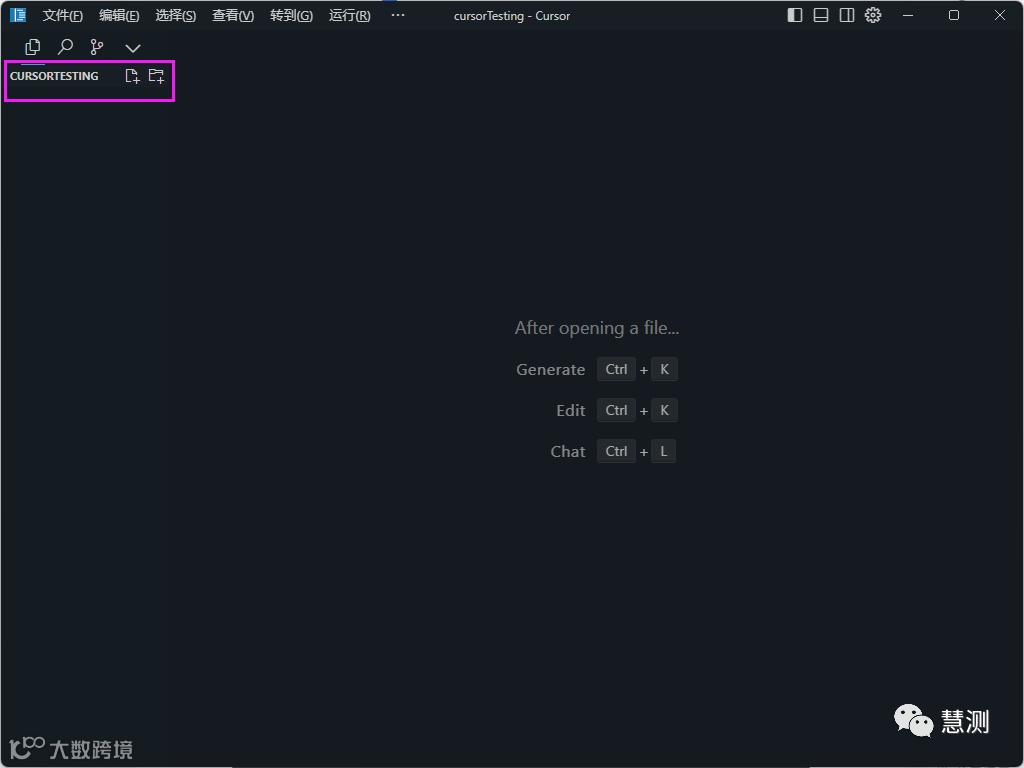 打开代码所在的文件夹,也可以选择一个新的文件夹(相当于 工作目录)后打开。例如我新建目录:cursortesting