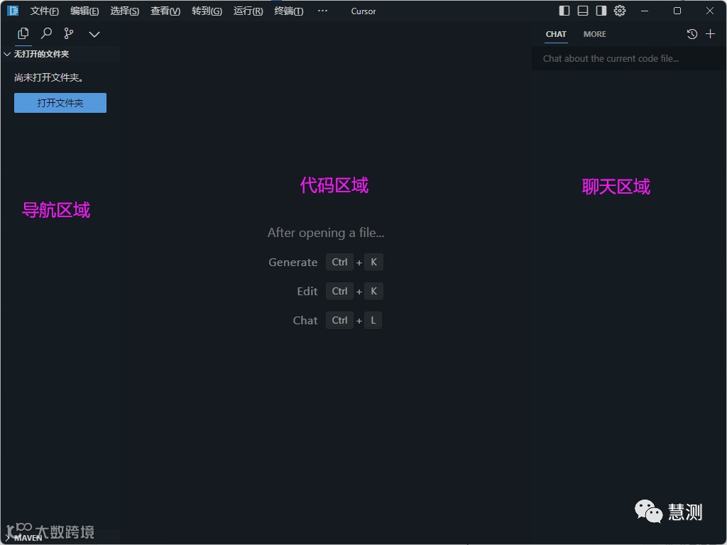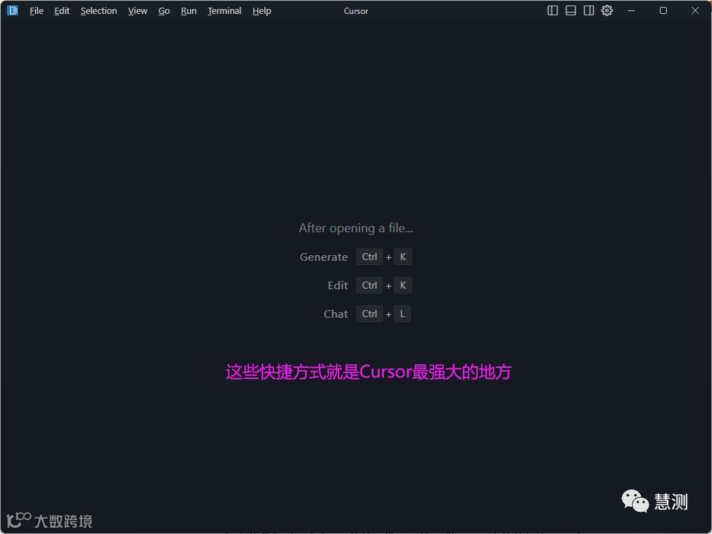 下载后默认安装即可,安装后即可看到如下界面,这些快捷方式是让你代码飞起来的强大武器(生成代码:Ctrl+K;对话聊天:Ctrl+L)
