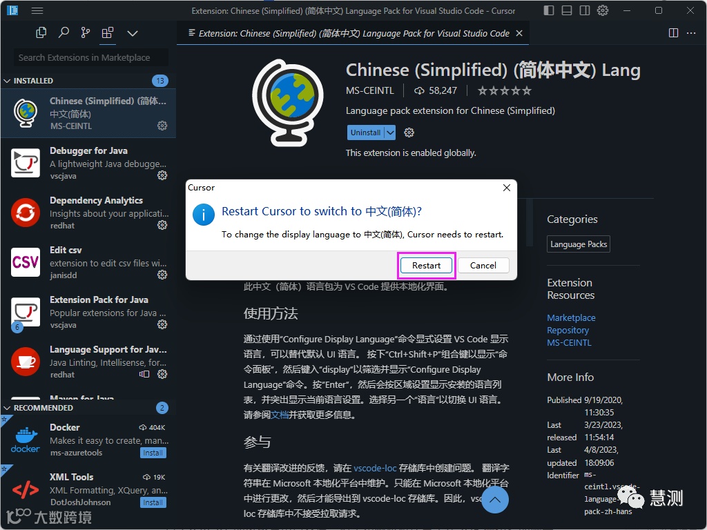 参考安装语言包插件的方式分别安装自己需要的语言插件,比如Python、Java、Js,例如: