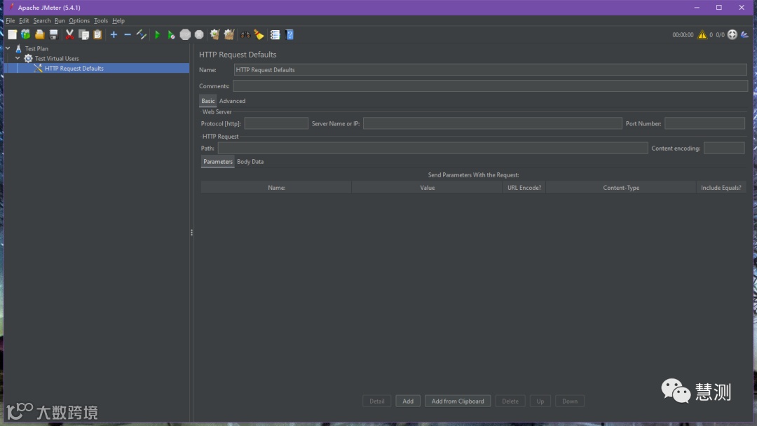 首先选择名为Test Virtual Users 的线程组元件,然后鼠标右键单击以弹出“添加”菜单,选择“添加”→“配置元件”→“ HTTP请求默认值”,添加完成后,选择该元件可以查看其配置面板。