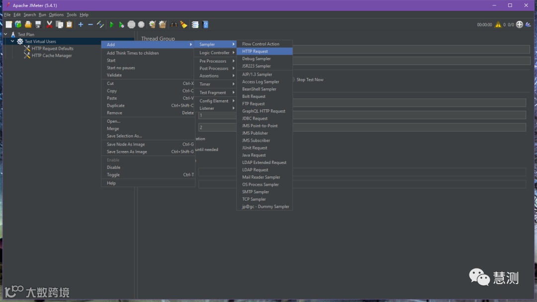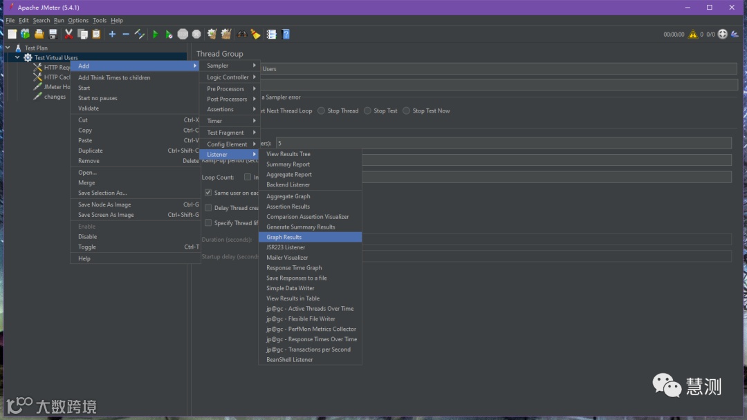 鼠标右键单击名为Test Virtual Users 的线程组元件,按照如下图所示步骤,即可将名为Graph Results的监听器添加到Test Virtual Users 线程组元件上。