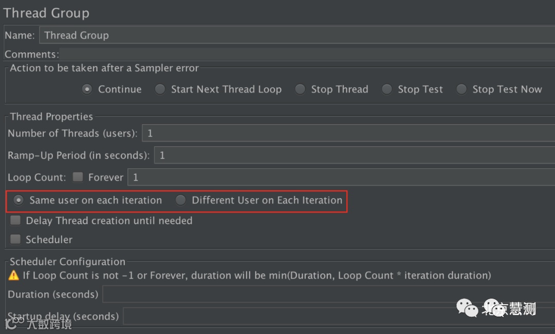 创建测试计划时,在每个线程组迭代中,用户可以选择模拟运行多个迭代的同一用户,或模拟运行一个迭代的不同用户。这两种模拟运行方式,用户可以在线程组元件上进行配置,通过配置,可使HTTP缓存管理器、HTTP Cookie管理器、HTTP授权管理器受此配置的控制。