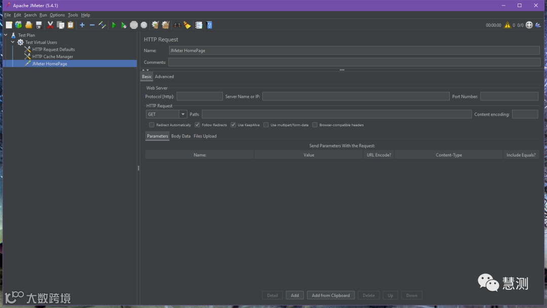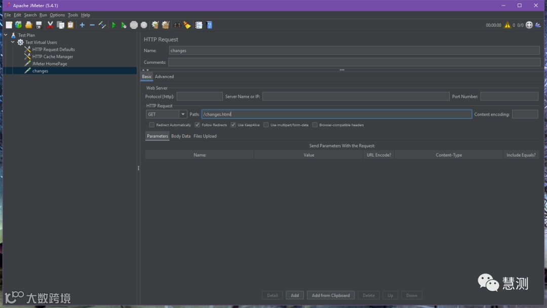 首先,将第一个HTTP请求添加到名为Test Virtual Users 的线程组元件(添加→采样器→HTTP请求)上。然后,在测试计划树中选中该元件并对以下属性进行编辑: