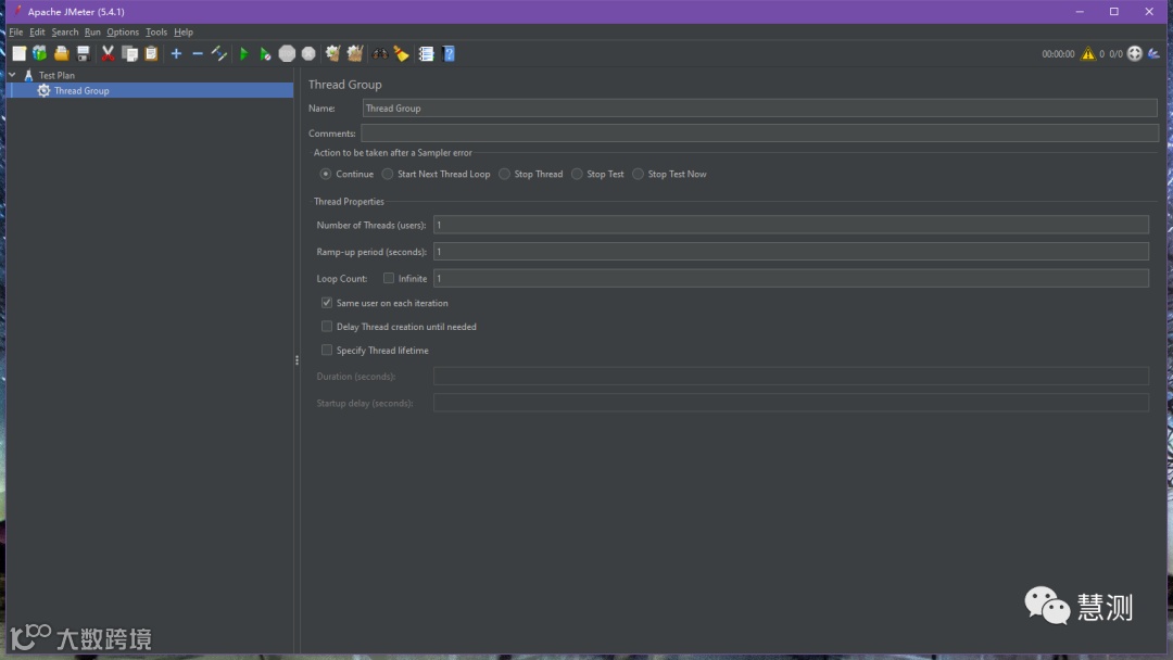 接下来,在测试计划树中选择线程组元件可对其默认属性进行修改。在JMeter窗口中的右侧部分所看到的即是线程组“配置面板”。