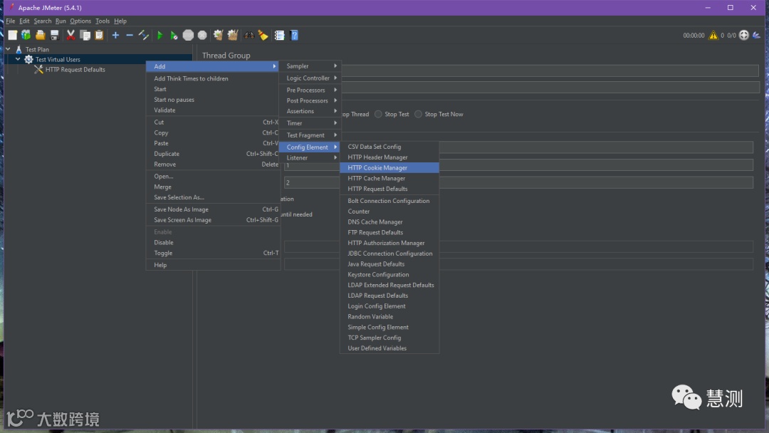 鼠标右键单击名为Test Virtual Users 的线程组元件,然后从弹出的菜单中选择“添加”→“配置元件”→“HTTP Cookie Manager”,即可添加HTTP Cookie Manager元件。