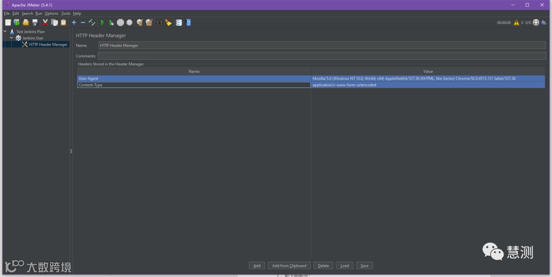 3、选中线程组,添加一个HTTP Header Manager(HTTP信息头管理器)。添加该元件的目的是为了避免JMeter发送请求后,返回结果可能会出现状态码为403的错误。如下图所示: