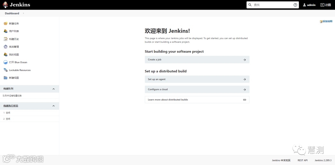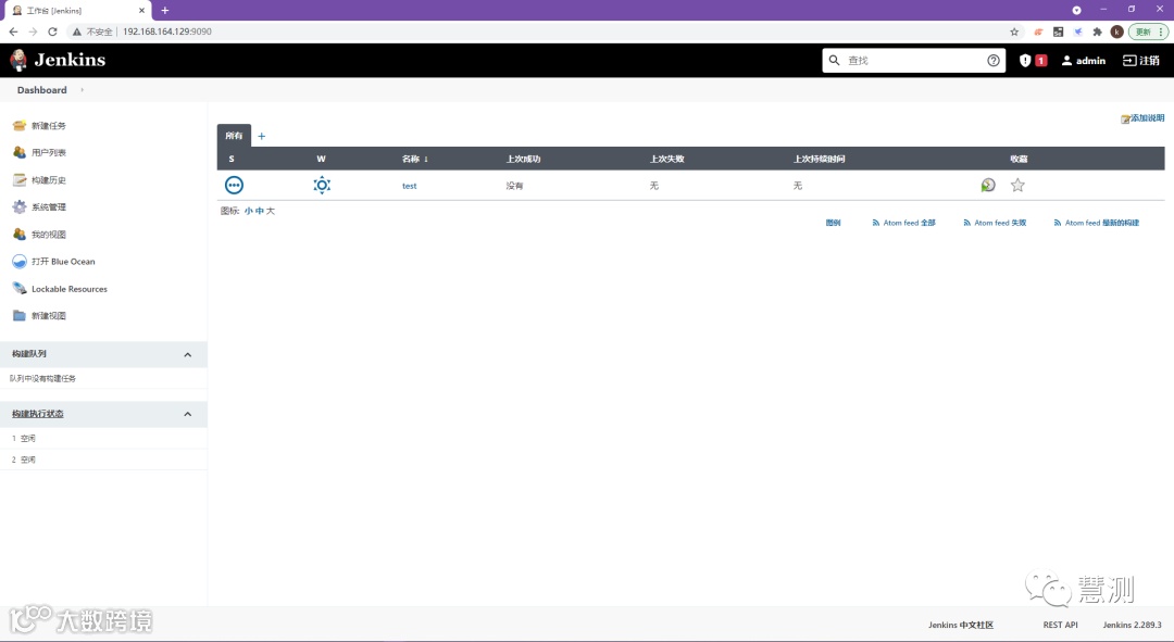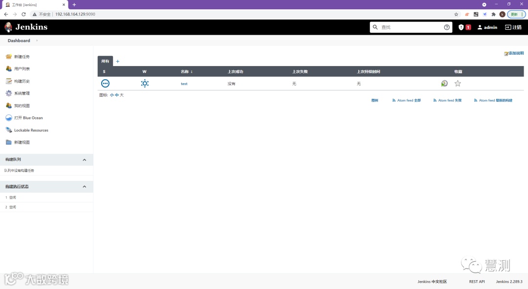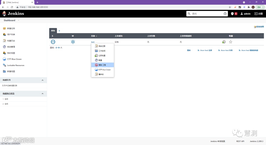 4、回到Jenkins中,查看新建任务,如果没有看到“test”,也能说明删除已成功,如下图所示: