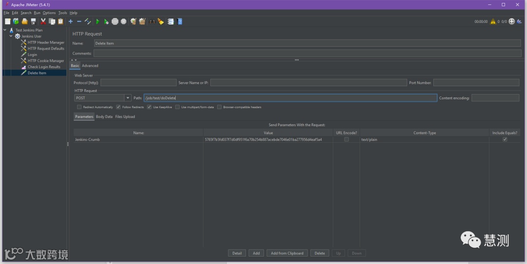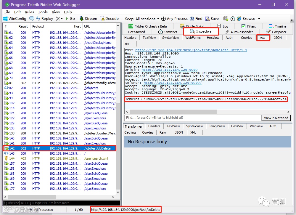 3、借助fiddler抓包工具抓取前一步骤中删除job的整个过程。从所抓取到的结果中可以看出,传的data参数是Jenkins-Crumb。如下图所示: