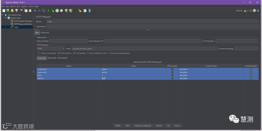 按照抓包抓取到的参数,接下来用JMeter模拟登录Jenkins。