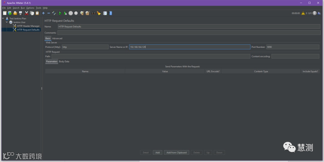 4、选中线程组,添加一个HTTP Request Defaults(HTTP请求默认值管理器)。该元件用来发送http默认请求值,其中,在Sever Name or IP参数对应的文本框中填写Jenkins的地址。使用该元件的好处是后续每新增加一条http请求,都不再需要重复填写被测网站的地址了。如下图所示:
