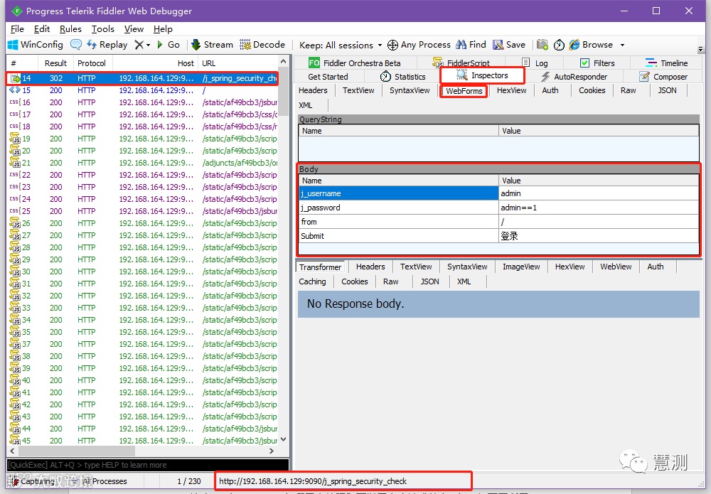 2、借助fiddler抓包工具抓取前一步骤中登录Jenkins的整个过程。从下图红框标注的部分可以看到所抓取到的登录的URL以及发出的登录请求所带的参数。如下图所示: