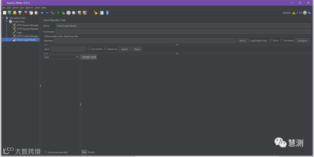 7、选中线程组,添加一个查看结果树,将其重命名为:Check Login Results,用以监听登录是否成功。如下图所示:
