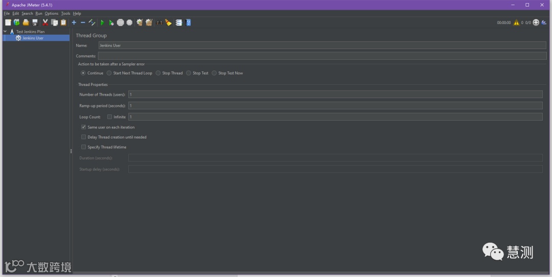 2、选中测试计划,添加线程组用户,命名为:Jenkins User。如下图所示:
