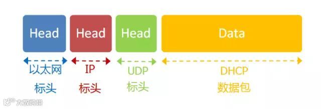 这个数据包构造完成后,就可以发出了。以太网是广播发送,同一个子网络的每台计算机都收到了这个包。因为接收方的MAC地址是FF-FF-FF-FF-FF-FF,看不出是发给谁的,所以每台收到这个包的计算机,还必须分析这个包的IP地址,才能确定是不是发给自己的。当看到发出方IP地址是0.0.0.0,接收方是255.255.255.255,于是DHCP服务器知道"这个包是发给我的",而其他计算机就可以丢弃这个包。