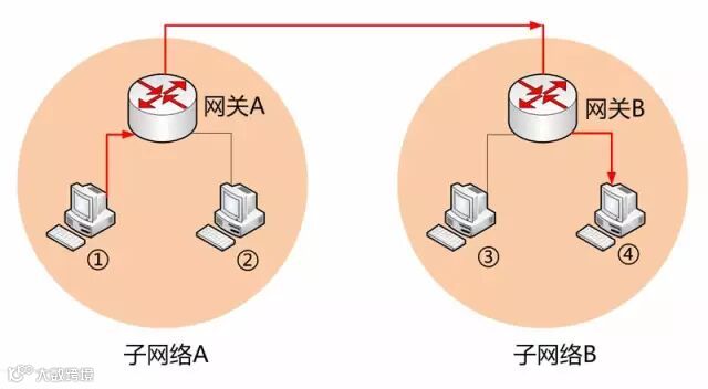 上图中,1号电脑要向4号电脑发送一个数据包。它先判断4号电脑是否在同一个子网络,结果发现不是(后文介绍判断方法),于是就把这个数据包发到网关A。网关A通过路由协议,发现4号电脑位于子网络B,又把数据包发给网关B,网关B再转发到4号电脑。