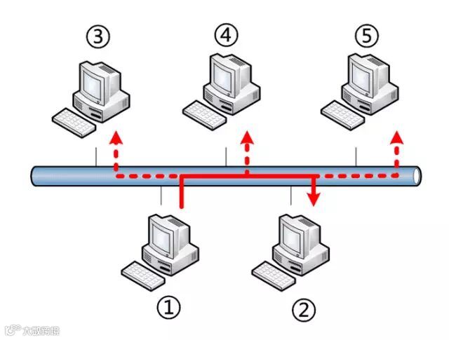 上图中,1号计算机向2号计算机发送一个数据包,同一个子网络的3号、4号、5号计算机都会收到这个包。它们读取这个包的"标头",找到接收方的MAC地址,然后与自身的MAC地址相比较,如果两者相同,就接受这个包,做进一步处理,否则就丢弃这个包。这种发送方式就叫做"广播"(broadcasting)。