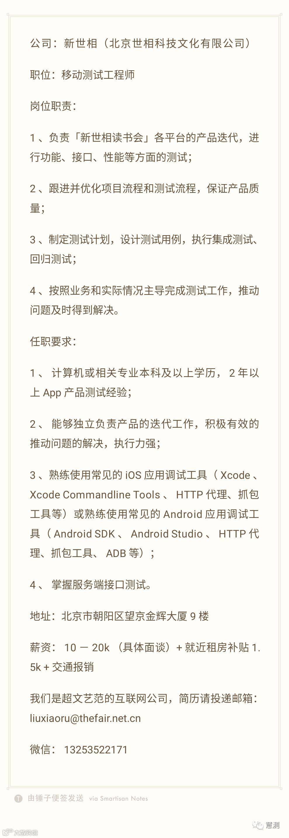 ①关注微信公众号“慧测”,每周查看最新IT软件测试相关岗位招聘!