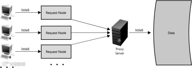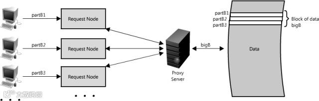 另一个使用代理的方式不只是合并相同数据的请求,同时也可以用来合并靠近存储源(一般是磁盘)的数据请求。采用这种策略可以让请求最大化使用本地数据,这样可以减少请求的数据延迟。比如,一群节点请求B部分信息:partB1,partB2等,我们可以设置代理来识别各个请求的空间区域,然后把它们合并为一个请求并返回一个bigB,大大减少了读取的数据来源(查看图Figure 1.15)。当你随机访问上TB数据时这个请求时间上的差异就非常明显了!代理在高负载情况下,或者限制使用缓存时特别有用,因为它基本上可以批量的把多个请求合并为一个。