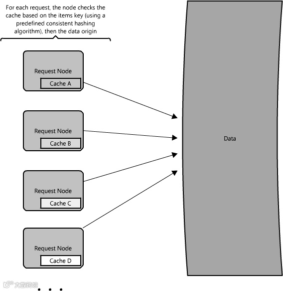 在分布式缓存(图1.12)中,每个节点都会缓存一部分数据。如果把冰箱看作食杂店的缓存的话,那么分布式缓存就象是把你的食物分别放到多个地方 —— 你的冰箱、柜橱以及便当盒 ——放到这些便于随时取用的地方就无需一趟趟跑去食杂店了。缓存一般使用一个具有一致性的哈希函数进行分割,如此便可在某请求节点寻找某数据时,能够迅速知道要到分布式缓存中的哪个地方去找它,以确定改数据是否从缓存中可得。在这种情况下,每个节点都有一个小型缓存,在直接到原数据所作处找数据之前就可以向别的节点发出寻找数据的请求。由此可得,分布式缓存的一个优势就是,仅仅通过向请求池中添加新的节点便可以拥有更多的缓存空间。