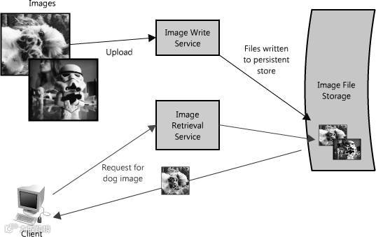 对于这种瓶颈,一个好的规划案例是将读取和写入图片分离为两个独立的服务,如图Figure 1.2.所示。这让我们可以单独的扩展其中任意一个(因为有可能我们读操作比写操作要频繁很多),同时也有助于我们理清每个节点在做什么。最后,这也避免了未来的忧虑,这使得故障诊断和查找问题更简单,像慢读问题。