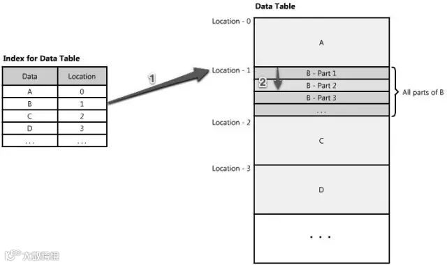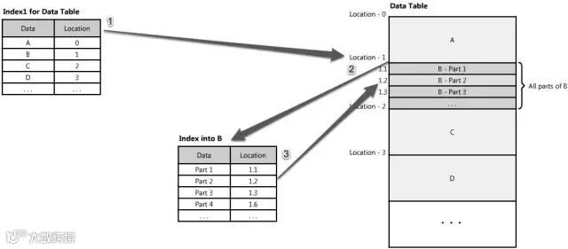 索引可以作为内容的一个表格-表格的每一项指明你的数据存储的位置。例如,如果你正在查找B的第二部分数据-你如何知道去哪里找?如果你有个根据数据类型(数据A,B,C)排序的索引,索引会告诉你数据B的起点位置。然后你就可以跳转(seek)到那个位置,读取你想要的数据B的第二部分。