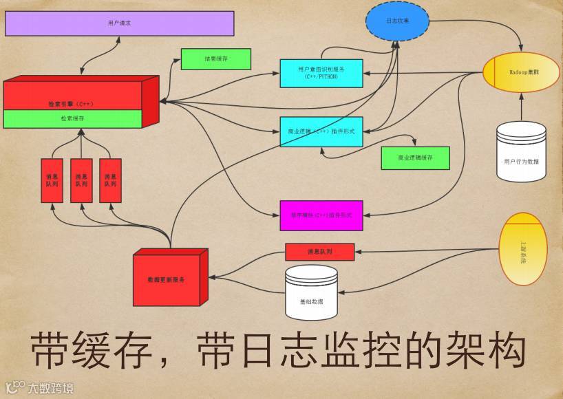 上图中的蓝色部分就是业务逻辑,因为电商的搜索引擎业务需求量非常高,尤其是现在大家都喜欢用手机进行购物,像手机专享价就是一个新的业务,这也意味着需要一个专用的模块来处理这些商用的逻辑。