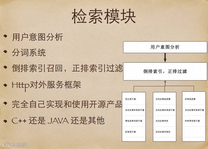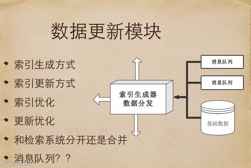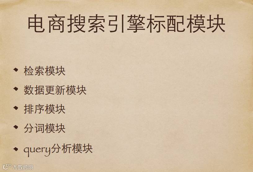 接下来我想讲一下,如果我们自己做一个搜索引擎的话需要实现哪些功能(上图是电商搜索引擎的标准模块),其实不止是电商搜索引擎,除了通搜的搜索引擎,其他的搜索引擎也是使用这样的标配。