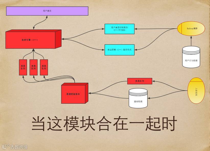 上图就是当两个系统合并在一起的时候,红色部分就是检索系统,黄色部分是上游产生数据的系统,如果是淘宝的话,对接就是淘宝的商户,当当网对接是市场部的人员,他们将数据录入系统,推到数据库,然后向下进行传送,最终建立一个索引。