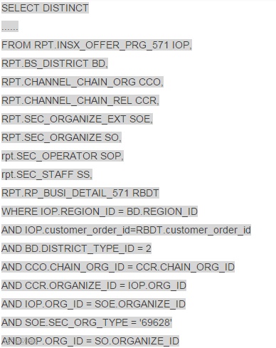 问题出在哪里呢?本sql缓慢的根源是括号,括号犯了什么罪?他造成了针对RP_BUSI_DETAIL_NNN(571 180G)进行全表扫描,而业务特点是读取distinctcustomer_order_id,SALER_ID且与RPT.INSX_OFFER_PRG_577的ustomer_order_id列进行关联。