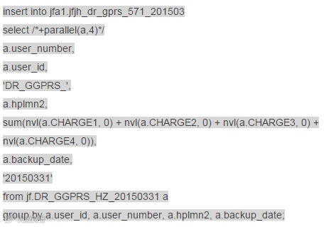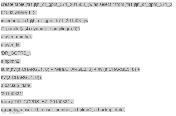 create table jf.tmp_tab1 parallel 10 nologging as select distinct user_number from jf.dr_ggprs_jx_20150203 where charging_characteristics='04';