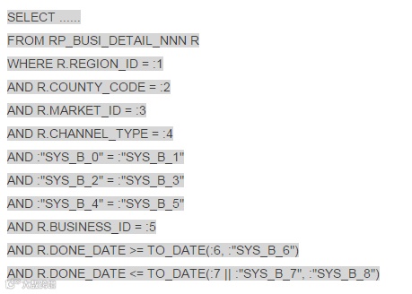 那么不带条件ORG_ID = :ORG_ID下能不能快呢?最后发现了一个关键点RP_BUSI_DETAIL_NNN是个按月分区表,每个分区只有1-6G,比起180G自然是小的多了!而且分区字段也是DONE_DATE,很可惜sql中没有利用到分区,立即联系需求侧和开发侧确认,INSX_OFFER_PRG_NNN和RP_BUSI_DETAIL_NNN两张表的DONE_DATE在业务意义上是否一致或者差距很小?是否可以把RP_BUSI_DETAIL_NNN表的DONE_DATE也一并放在条件中?非常幸运,我的这个提议立刻得到了肯定的回复,在后续的沟通和测试下,重新定制了业务规则,最多只能按自然月查询(考虑表按自然月分区)查询,业务超时由原来的50秒改成3分钟,最终将SQL改写成了: