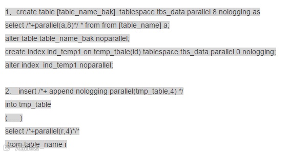 Parallel并行:合理的利用parallel可以有效利用资源,提高执行效率。但是在日常生产期间,核心库不允许吆!Parallel开的越高,就是并行度越高,那么资源使用就越严重,所以既要考虑效率,也要考虑负载,曾经在某些系统中抓到了/*+parallel(a,64)*/,这位老兄!我们逻辑的CPU也不过只有32颗!