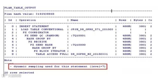 动态采样怎么办呢?这个DR_GGPRS_XX_YYYYMMDD表大地市超过400G,想收集统计信息是不可能的,何况作业每天仅仅跑一次,也不存在什么游标共享的问题了,干脆直接绑定执行计划,避免动态采样,在2号节点测试一下。