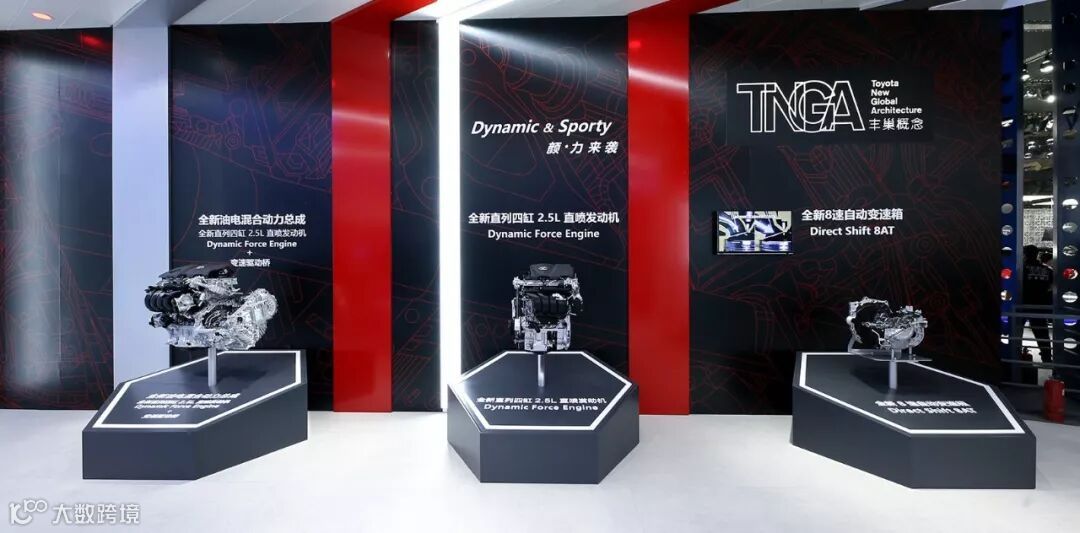 展台设计方面,以“丰巢TNGA概念—Dynamic&Sporty 颜・力来袭”中的TNGA-以骨骼从零开始为要点,结合年度推广第三阶段的Dynamic&Sporty,制作了环抱整体的大型工业化骨架结构立体亮点造型,最恰当的体现了丰田丰巢概念造车理念的同时,也将年度推广第三阶段的颜・力来袭进行了感性的诠释。