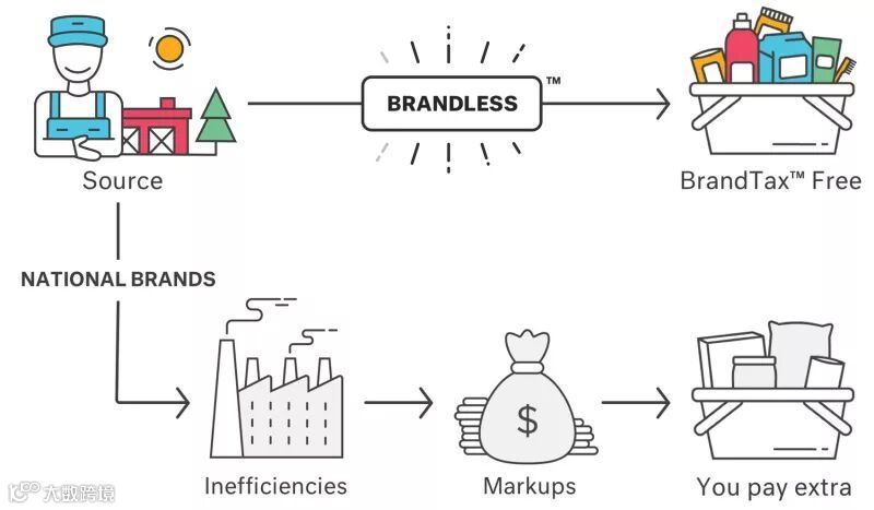 Brandless 是一个在线贩卖各类杂货及保健产品的品牌。所有贩卖的食物都是非转基因,且大部分都是有机的。每一个品类——从蜂蜜到肥皂——都只卖 3 美金。Brandless 宣称藉由去掉了“品牌税”,省下这些消费者额外付给国际品牌的费用,从而提供较低的价格给消费者。