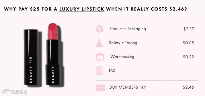 Beauty Pie 用工厂的价格贩卖高级保养品给他们的会员:顾客需要每个月付费 10 美金成为会员,然后只需花2.46美元就可买到市面上价值25美元的高级口红。