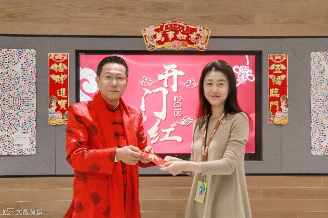 北京总部的活动在5层公共区域举办,通知邮件9:50刚一发出,各部门同事就在楼梯排起长队,等待来自总经理的新春祝福。10:30马场CEO出现在团拜会现场,向到场同事派发“开工红包”并送上问候。他用中文向大家拜晚年“祝大家新春快乐,让我们新年一起加油。”现场热火朝天、喜气洋洋的氛围在随后的合影中淋漓尽致的体现。