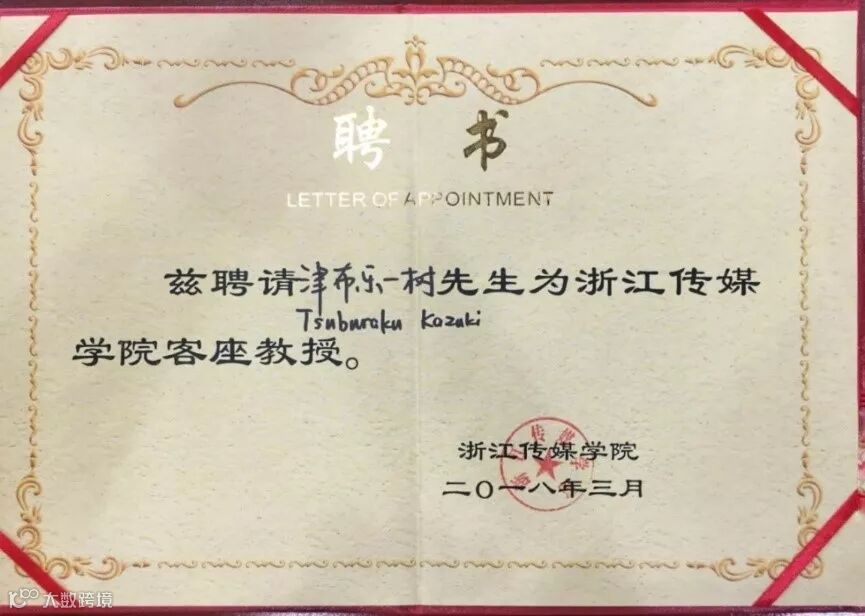 津布乐一树接受浙江传媒学院颁发的客座教授聘书