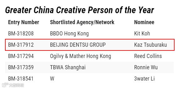 “第一次入围AOY大中华区年度创意人物十分开心,期待北京电通今后有更多创意人入围,更多好的创意作品出现。”