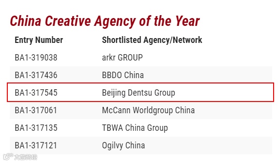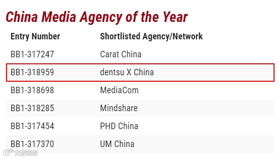 * Campaign AOY:Campaign Agency of the Year评选已走过24个春秋,始终致力于表彰广告及传播行业的创新领导力、优秀管理团队、出色的业务表现及整体企业运营,几乎所有国际及本地4A代理商及行业优秀人物都会积极准备并参加AOY的评选以展现公司及个人实力。AOY的评审均来自全球著名品牌集团的高管以及广告公关媒介精英人物,提交的阐述内容以及视频制作需要以英文呈现给评审,必须具备国际水准和高精质量。因此,获得AOY的入围甚至金银铜奖的荣誉将极大彰显代理商在行业的竞争力。