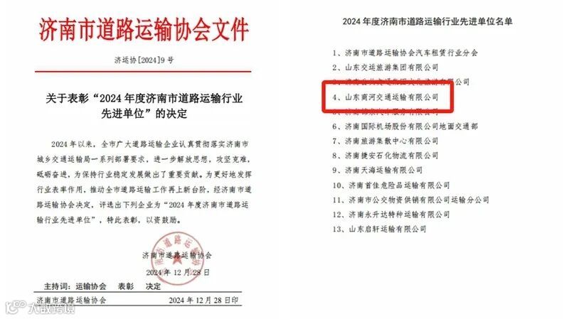 2024年12月28日上午,济南市道路运输协会五届二次会员代表暨道路危险货物运输行业分会成立大会召开,会上会长刘得利表彰了2024年度全市道路运输行业先进单位,山东商河交通运输有限公司(以下简称:山商交运)荣获“2024年度全市道路运输行业先进单位”称号。这一年我们公司职工团结一致,努力拼搏,勇于创新,扎实工作,此次获得荣誉,是鼓励,更是鞭策。