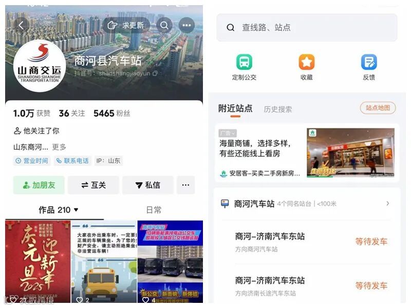 为了提升服务水平,方便广大旅客查询实时线路班次信息、随时了解班车动态,依托微信公众号、掌上公交、抖音等新媒体平台,旅客可通过关注微信公众号和抖音号,提前了解车辆班次信息,通过掌上公交可实时了解公交到站信息,大大减少了等车的时间,让出行更加便利。当前微信公众号(山商交运&商河县汽车站)粉丝累计94271人,抖音粉丝5465人,掌上公交用户使用量达98631人。