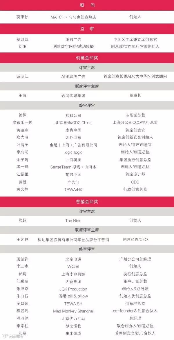 本届金印奖本着开放创新的原则,设置总顾问、总监审、评审主席、联席评审主席的全新评审组织模式,由来自全行业的26位广告精英、跨界先锋、青年创业家及媒体组成最强评审阵容。屠剑峰与津布乐一树凭借各自在行业中的成就与建树,分别受邀担任在营销金印奖与创意金印奖的终审评审,这也是继2015年和2016年GECD依田洋出任中国4A金印奖评审后,北京电通人再次受邀担任此中国重量级创意奖项的评审。此前,屠剑峰被中国商务广告协会授予中国广告智库专家称号,津布乐一树已连续三年担任戛纳幼狮中国区评审。