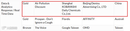 9月27日,2017 Tangrams Effectiveness @ Spikes Awards (原AMES亚洲实效营销奖) 颁奖典礼在新加坡举行。北京电通作品《Air Pollution Discount》荣获Data & Analytics (数据及分析类) 金奖,这是继去年北京电通荣获2铜后,再次荣获此奖项。获奖团队代表北京电通上海分公司CCO / CDC China执行总监津布乐一树出席了颁奖仪式。