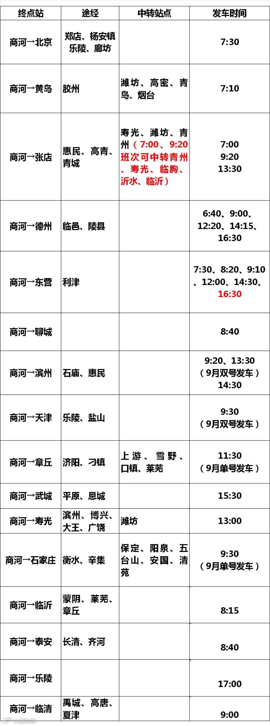 9月长途客车时间表,快来收藏吧!请持续关注微信公众号【山商交运】&【商河县汽车站】,以最新通知为准。如有疑问,欢迎拨打0531-84880035咨询。以下为9月长途客车运营班次: